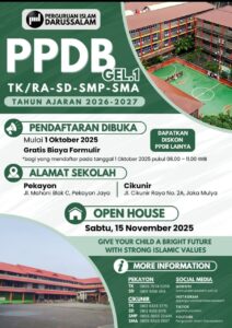 Bekasi – Perguruan Islam Darussalam (PID) kembali membuka Penerimaan Peserta Didik Baru (PPDB) untuk Tahun Ajaran 2025/2026 dan 2026/2027. Pendaftaran resmi dibuka mulai 1 Oktober 2025 dengan berbagai kemudahan bagi calon wali murid, termasuk gratis biaya formulir bagi yang melakukan pendaftaran di hari pertama antara pukul 08.00 – 11.00 WIB.